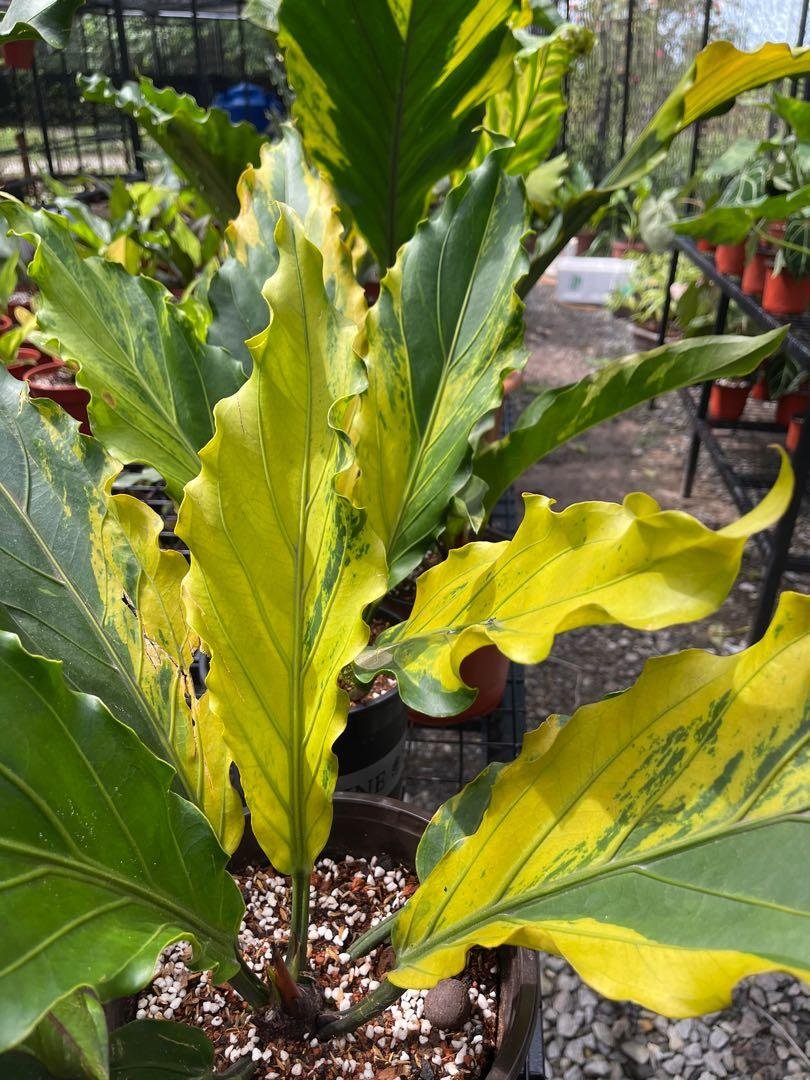 - Displays vibrant yellow variegation on its broad green leaves, creating a bold and eye-catching contrast.