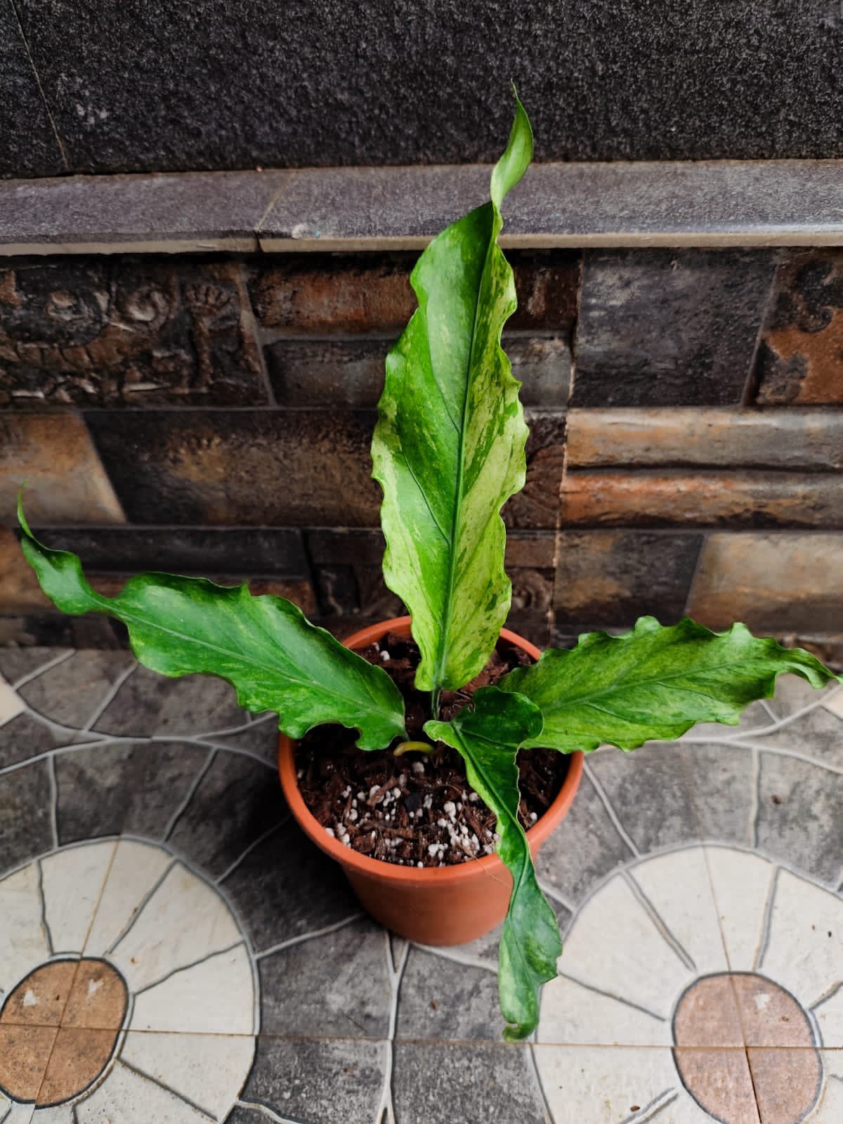 - The broad, glossy leaves display a distinctive mint-green variegation, creating a vibrant contrast against the darker green base.
