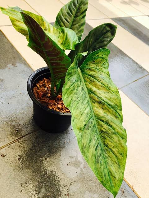 - Features large, lance-shaped leaves with a blend of green and cream or yellow variegation on the top surface.